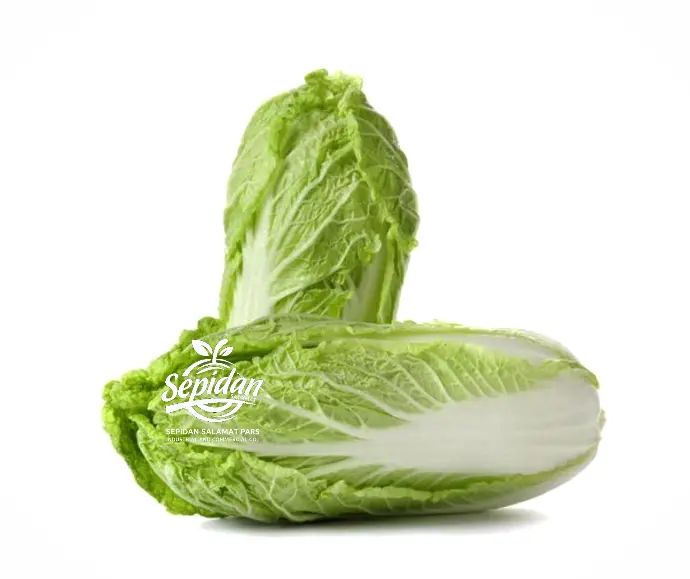 کاهو چینی بلند و کشیده با برگهای سفید-سبز روشن، ترد و شیرین با بافت نرم و آبدار.