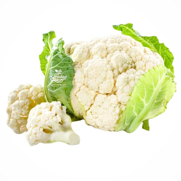 گل کلم سفید تازه و یکدست با گلهای متراکم، براق و بدون لک زرد، بافت سفت و ترد.